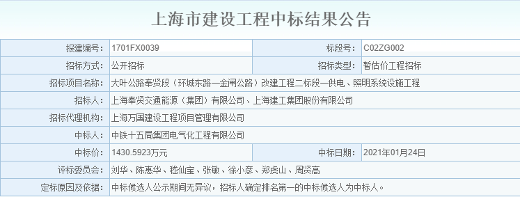 中标结果公告-大叶公路奉贤段(环城东路—金闸公路)改建工程二标段—供电、照明系统设施工程