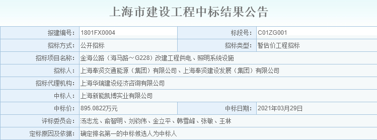 中标结果公告-金海公路(海马路~G228)改建工程供电、照明系统设施