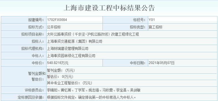 中标结果公告-大叶公路奉贤段(千步泾~沪杭公路改线)改建工程绿化工程
