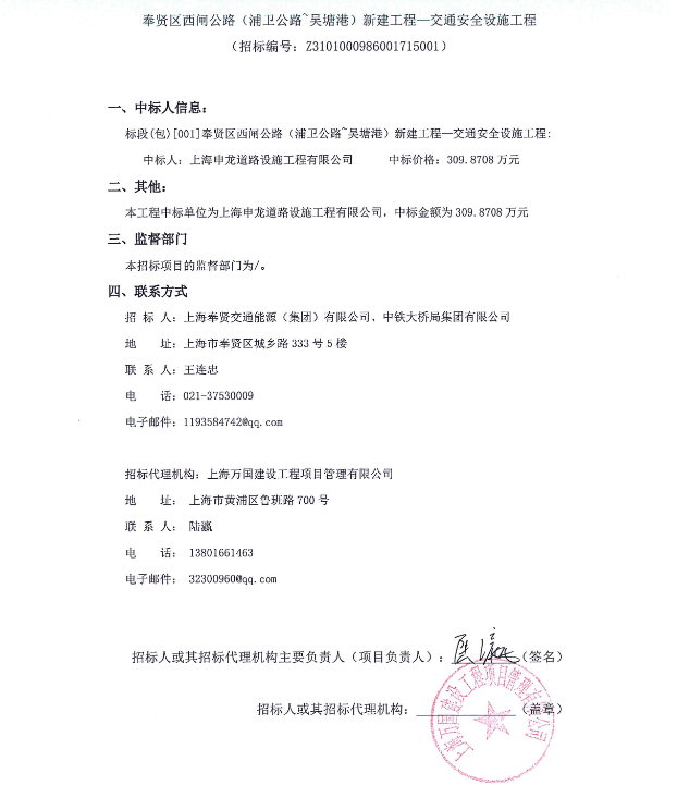 中标结果公告-奉贤区西闸公路(浦卫公路~吴塘港)新建工程—交通安全设施工程