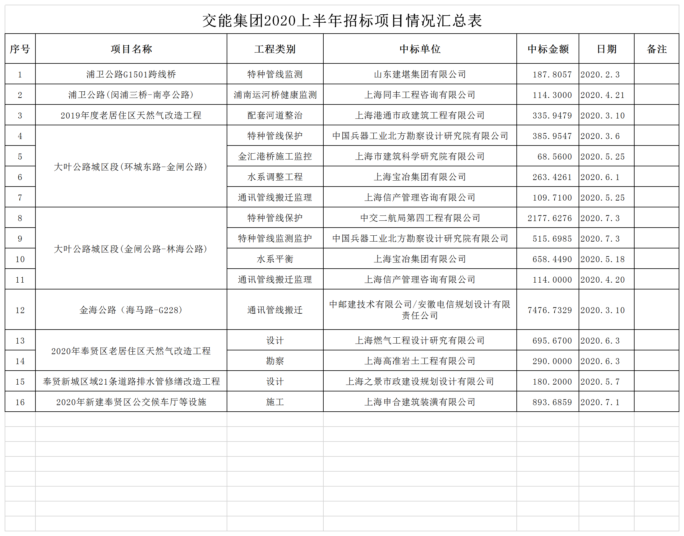 交能集团2020上半年招标项目情况汇总表
