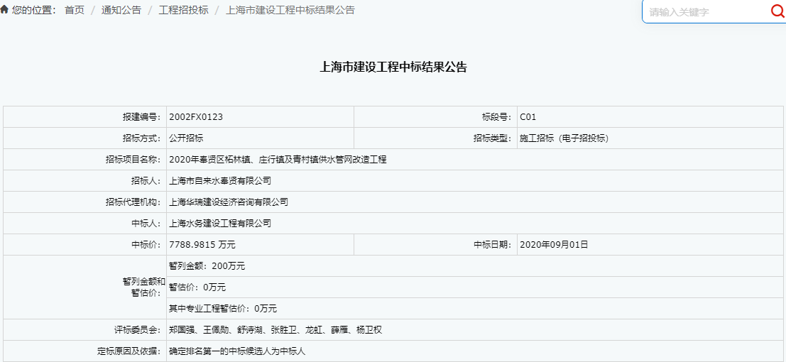 2020年奉贤区柘林镇、庄行镇及青村镇供水管网改造工程-施工中标结果