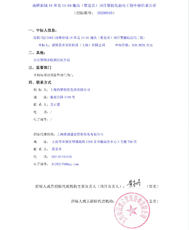 南桥新城18单元15-04地块(暂定名)项目智能化弱电工程中标结果公示