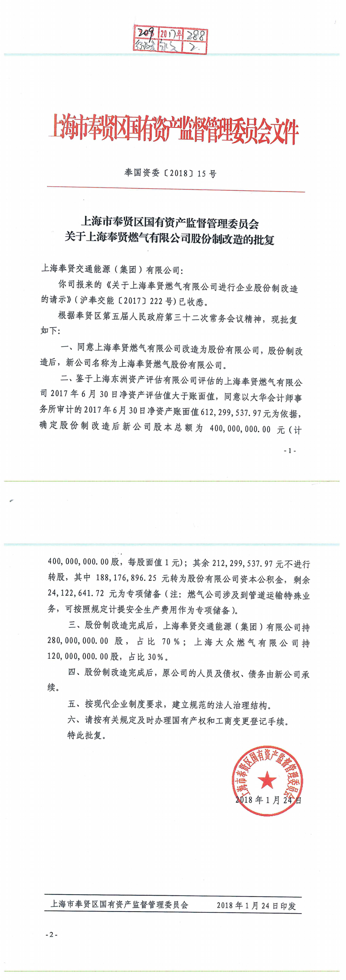 奉国资委[2018]15号关于上海奉贤燃气有限公司股份制改制