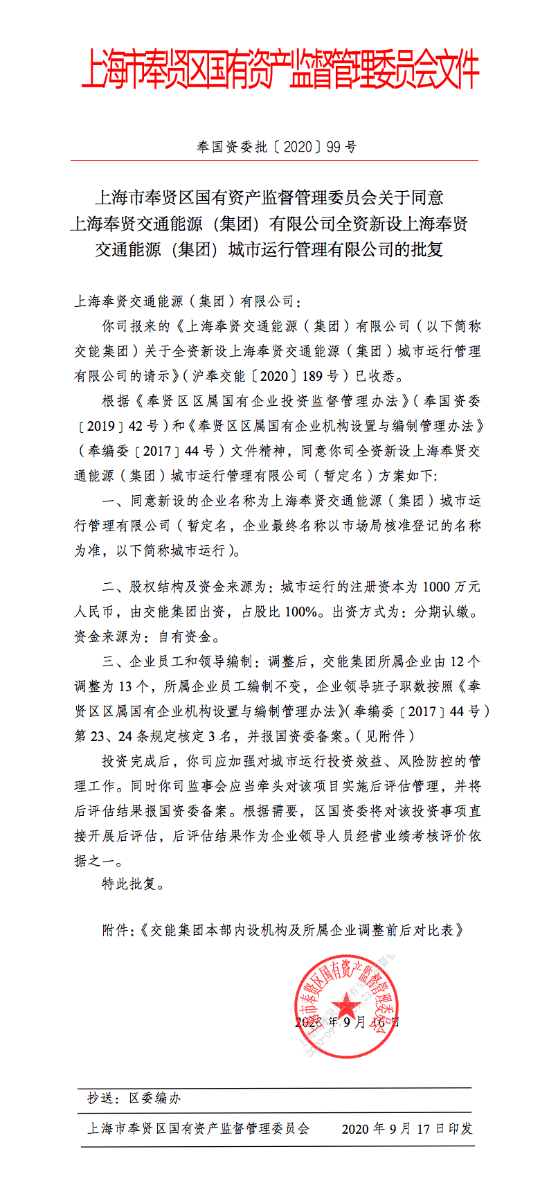 奉国资委批〔2020〕99号上海市奉贤区国有资产监督管理委员会关于同意上海奉贤交通能源(集团)有限公司全资新设上海奉贤交通能源(集团)城市运行管理有限公司的批复(有章)