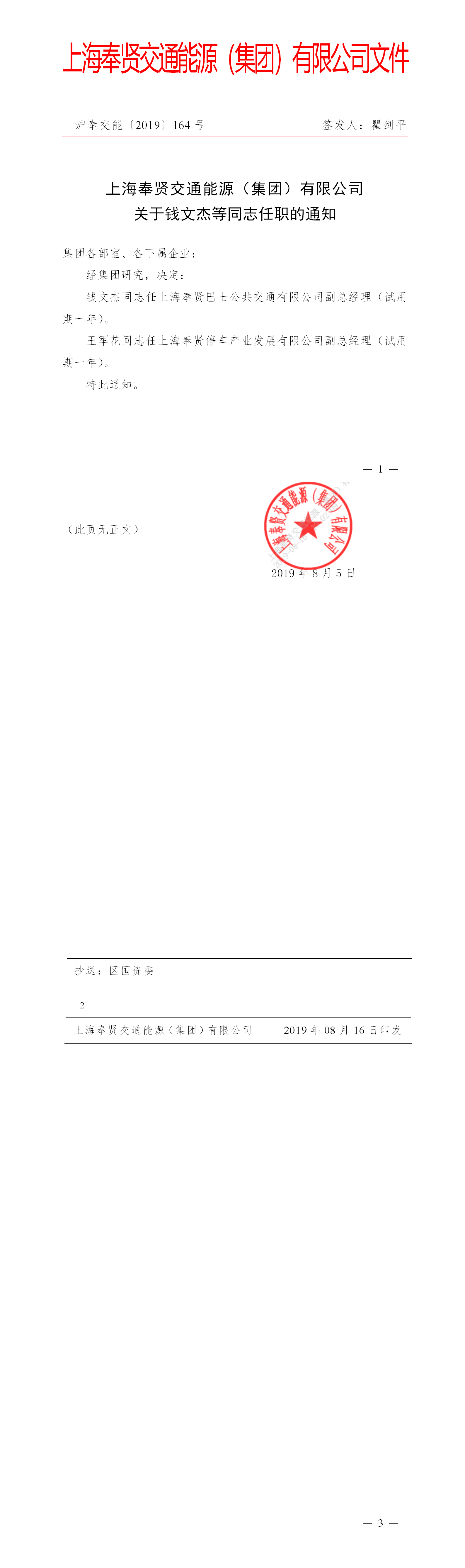 关于钱文杰等同志任职的通知