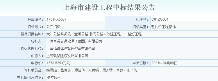 中标结果公告-大叶公路奉贤段(金闸公路-林海公路)改建工程——路灯工程