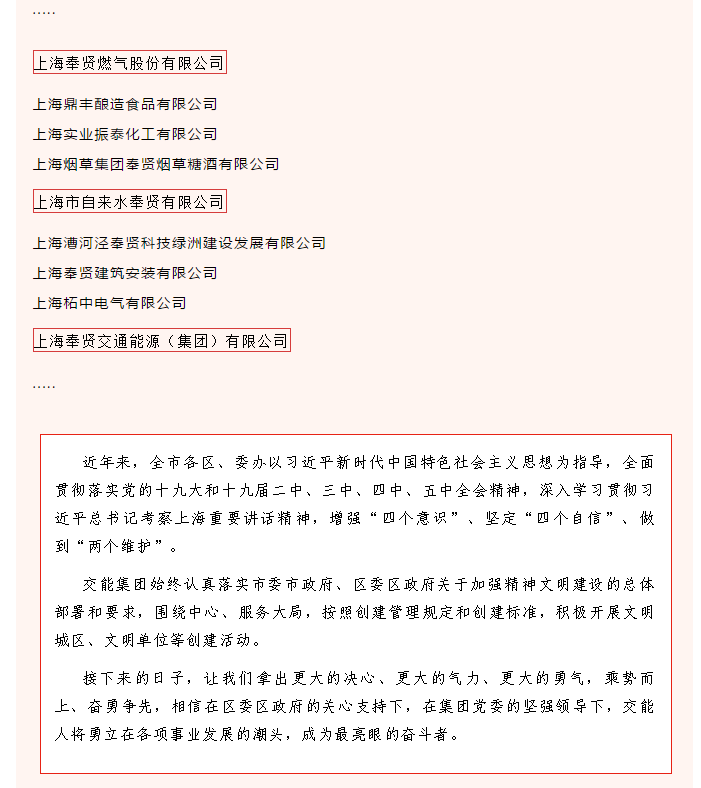 喜讯!交能集团及下属上水奉贤公司、奉贤燃气公司荣获市级荣誉