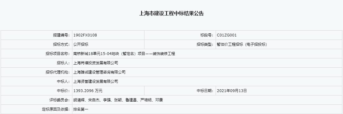 中标结果公告-南桥新城18单元15-04地块(暂定名)项目—装饰装修工程