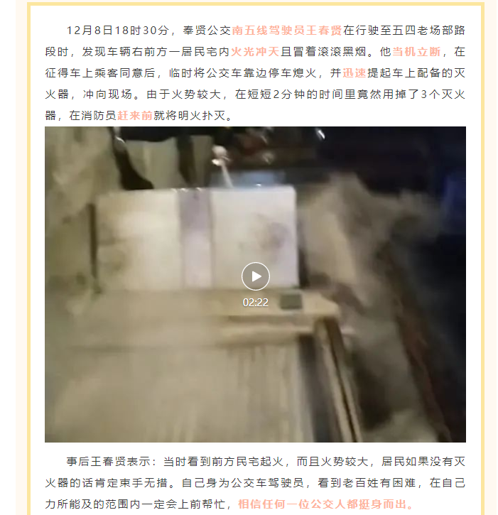 王春贤,好样的!奉贤公交司机挺身救火