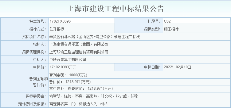 中标结果公告-奉贤区新林公路(金山区界~浦卫公路)新建工程二标段