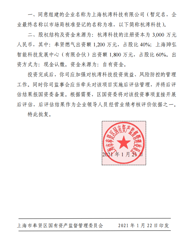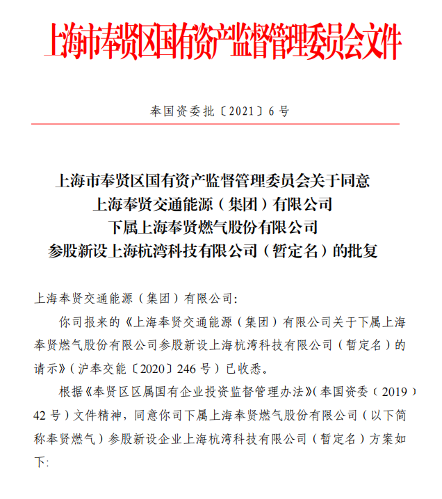 奉国资委批〔2021〕6号上海市奉贤区国有资产监督管理委员会关于同意上海奉贤交通能源(集团)有限公司下属上海奉贤燃气股份有限公司参股新设上海杭湾科技有限公司(暂定名)的批复