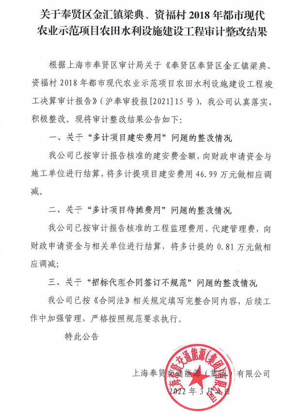 关于奉贤区金汇镇梁典、资福村2018年都市现代农业示范项目农田水利设施建设工程审计整改结果