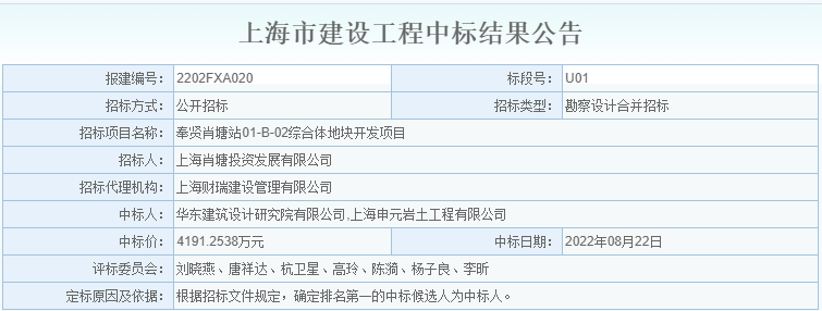 中标结果公示-奉贤肖塘站01-B-02综合体地块开发项目设计勘察