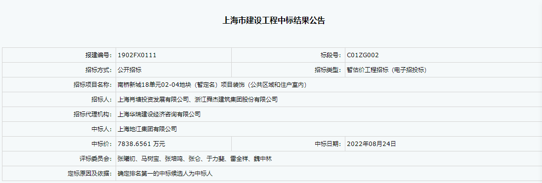 中标结果公告-南桥新城18单元02-04地块(暂定名)项目装饰(公共区域和住户室内)