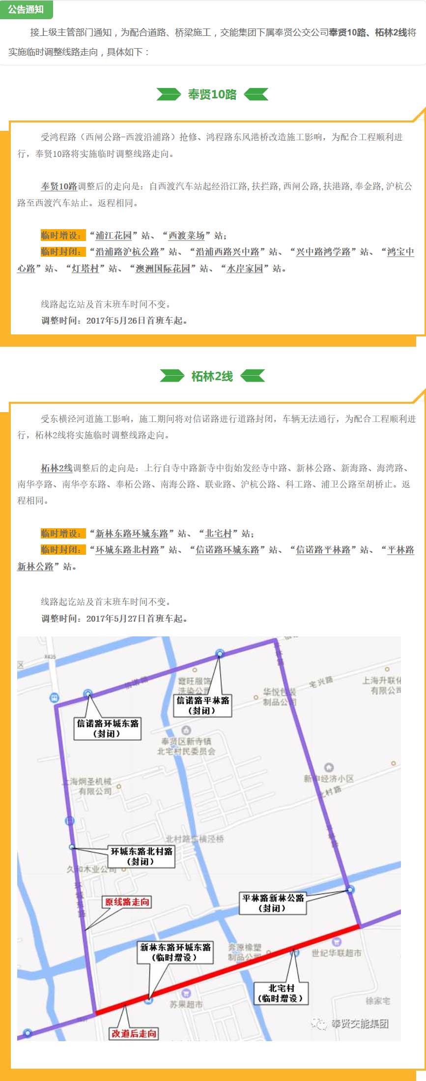 【便民】奉贤10路、柘林2线临时调整线路走向公告