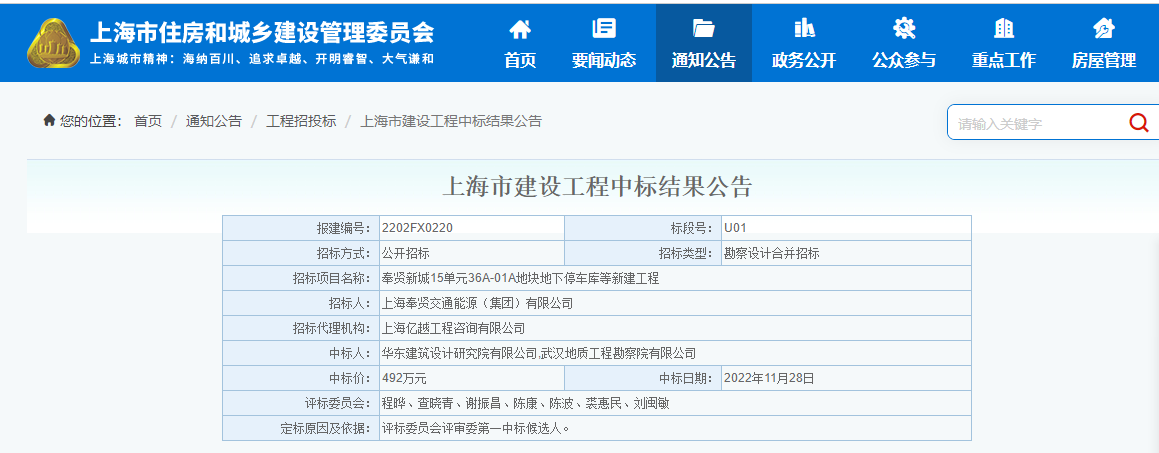 中标结果公告-奉贤新城15单元36A-01A地块地下停车库等新建工程(设计勘察)