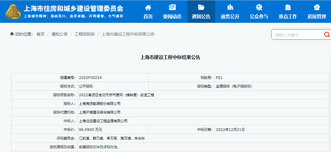 中标结果公告-2022奉贤区老旧天然气管网(铸铁管)改造工程(监理)