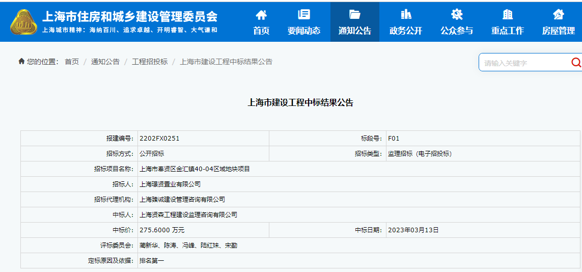 中标结果公告-上海市奉贤区金汇镇40-04区域地块项目(监理)