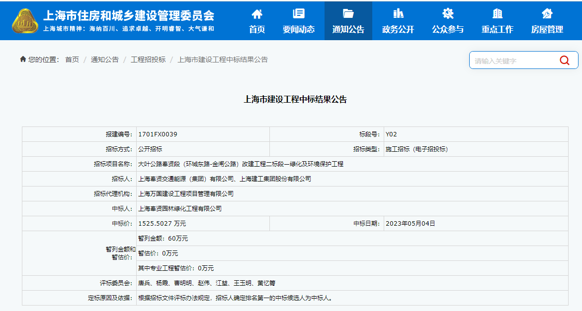 中标结果公告- 大叶公路奉贤段(环城东路-金闸公路)改建工程二标段—绿化及环境保护工程