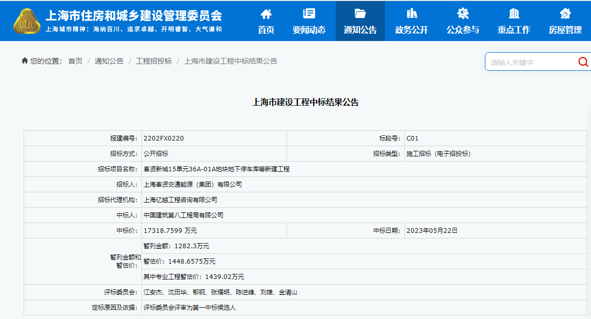 中标结果公告-奉贤新城15单元36A-01A地块地下停车库等新建工程