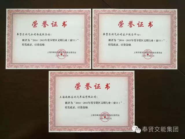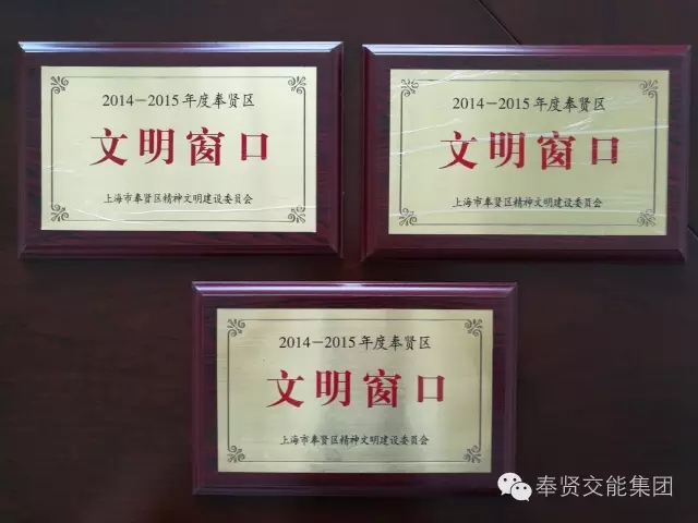 2016年8月,交能集团下属公司燃气公司西渡服务站、客运服务中心以及南桥客运汽车站有限公司喜获”2014-2015年度奉贤区文明行业(窗口)“称号,并获得由奉贤区精神文明建设委员会颁发的文明窗口奖牌。