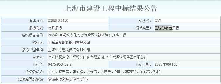 中标结果公告-2024年奉贤区老化天然气管网(铸铁管)改造工程(工程总承包)