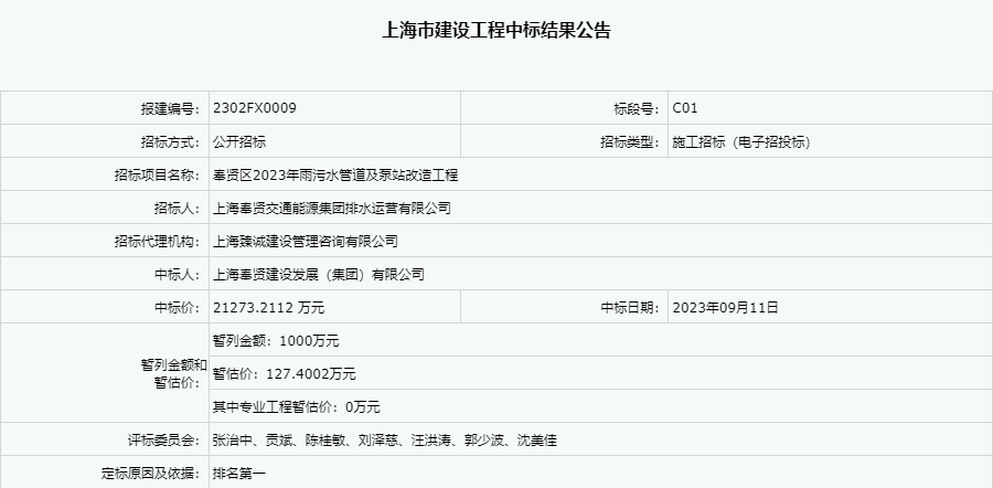 中标结果公告-奉贤区2023年雨污水管道及泵站改造工程(施工招标)