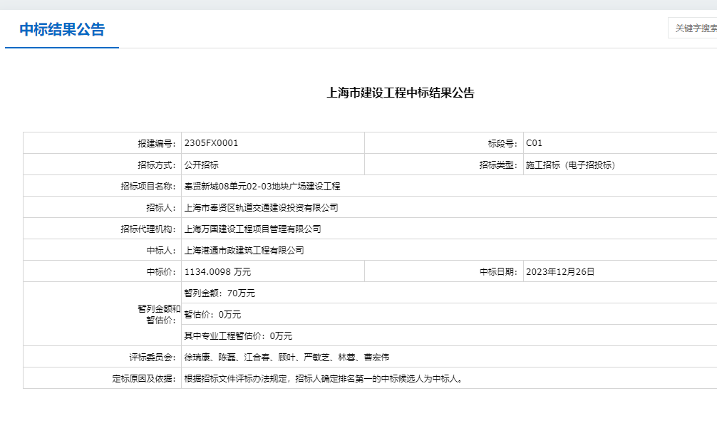 中标结果公告-奉贤新城08单元02-03地块广场建设工程