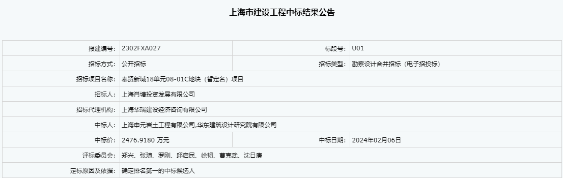 中标结果公告-奉贤新城18单元08-01C地块(暂定名)项目-勘察设计