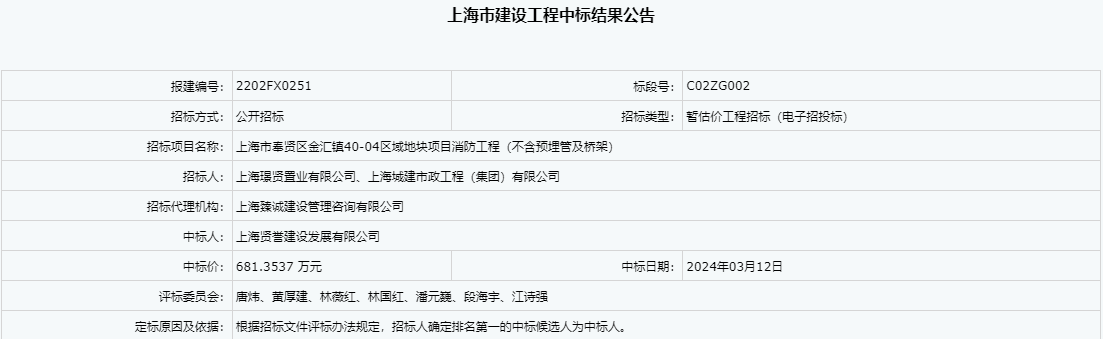 中标结果公告-上海市奉贤区金汇镇40-04区域地块项目消防工程(不含预埋管及桥架)