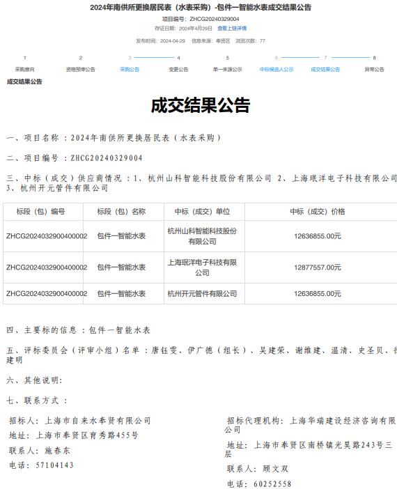 中标结果公告-2024年南供所更换居民表(水表采购)-包件一智能水表