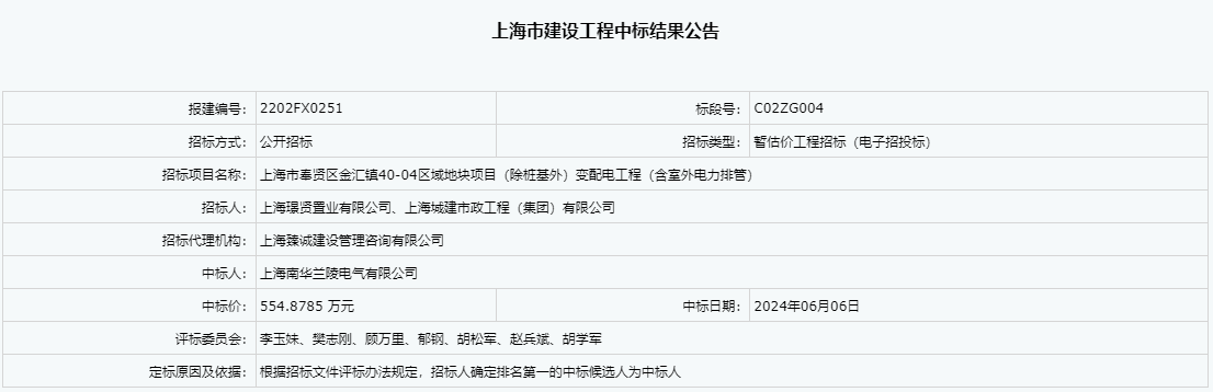 中标结果公告-上海市奉贤区金汇镇40-04区域地块项目(除桩基外)变配电工程(含室外电力排管)