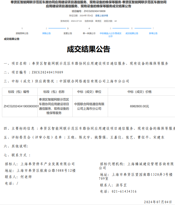 中标结果公告-奉贤区智能网联示范区车路协同应用建设项目通信服务、现有设备的维保等服务