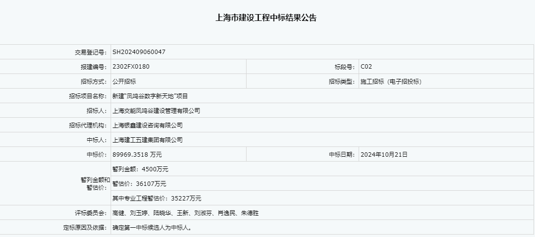 中标结果公告-新建“凤鸣谷数字新天地”项目