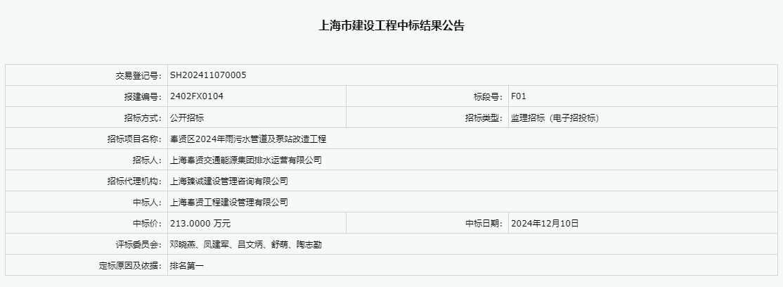 中标结果公告- 奉贤区2024年雨污水管道及泵站改造工程(监理)