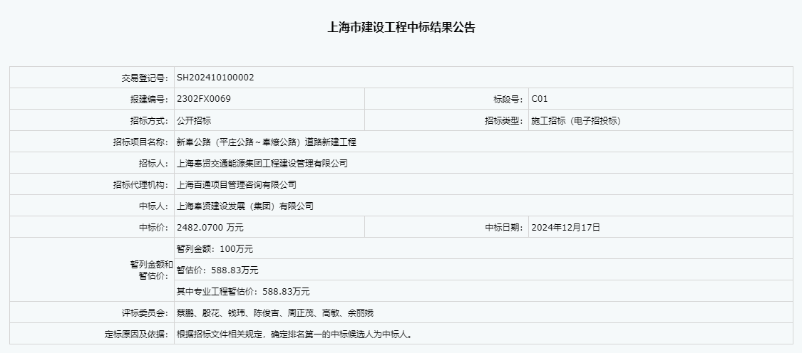 中标结果公告-新奉公路(平庄公路~奉燎公路)道路新建工程