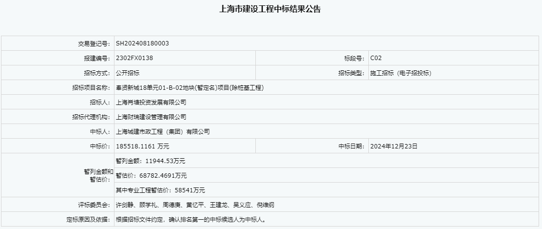 中标结果公告-奉贤新城18单元01-B-02地块(暂定名)项目(除桩基工程)