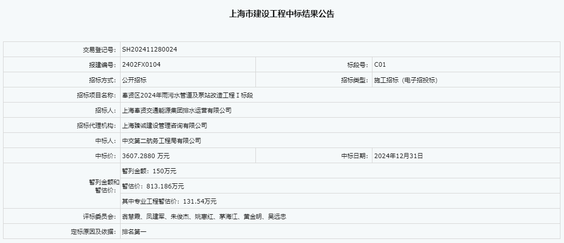 中标结果公告-奉贤区2024年雨污水管道及泵站改造工程Ⅰ标段