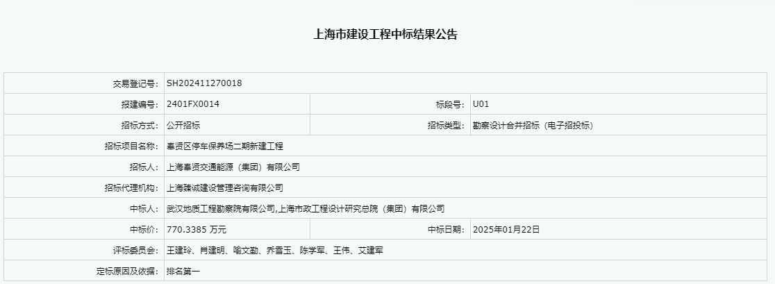 中标结果公告-奉贤区停车保养场二期新建工程(设计勘察)