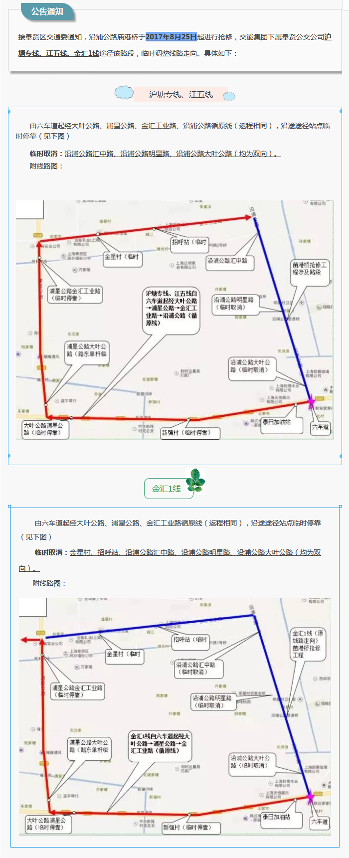 关于奉贤巴士公交沪塘专线、江五线、金汇1线临时调整走向公告