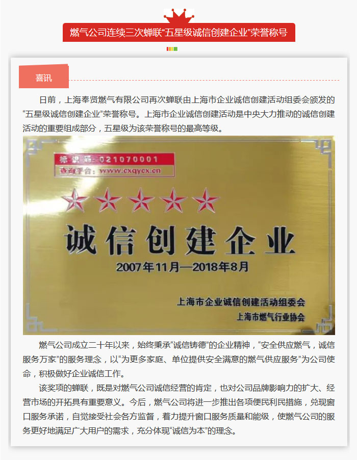 交能集团下属燃气公司连续三次蝉联“五星级 诚信创建企业”荣誉称号