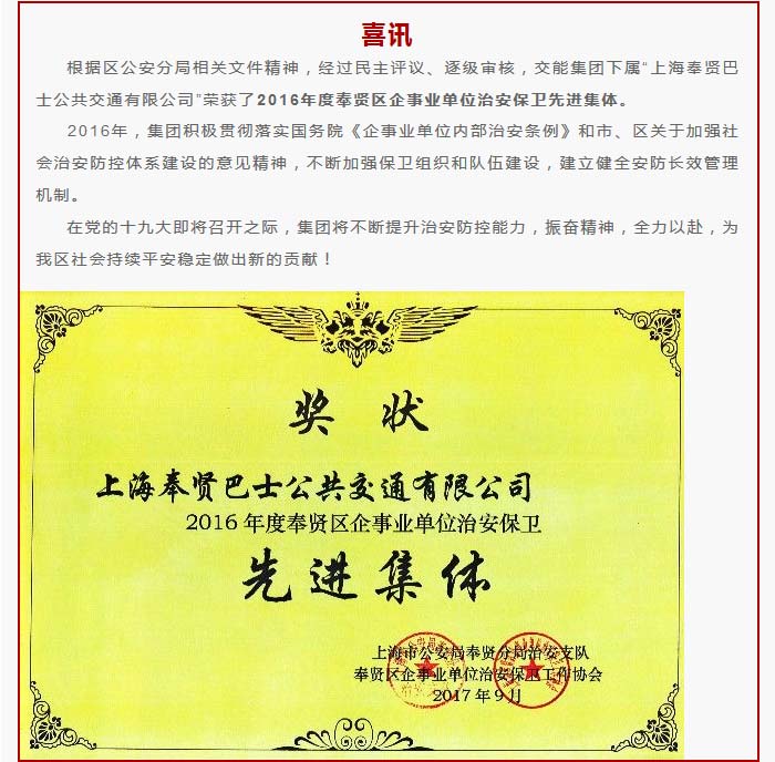 【喜讯】奉贤公交荣获治安保卫先进集体
