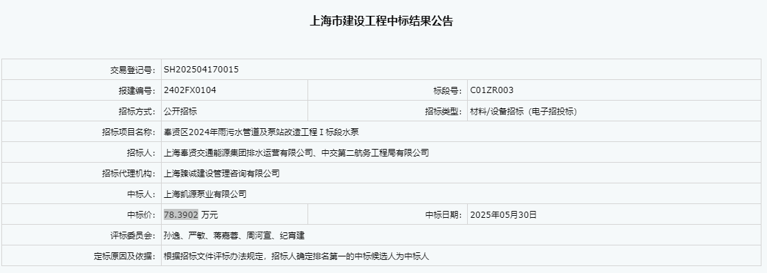 中标结果公告-奉贤区2024年雨污水管道及泵站改造工程Ⅰ标段水泵