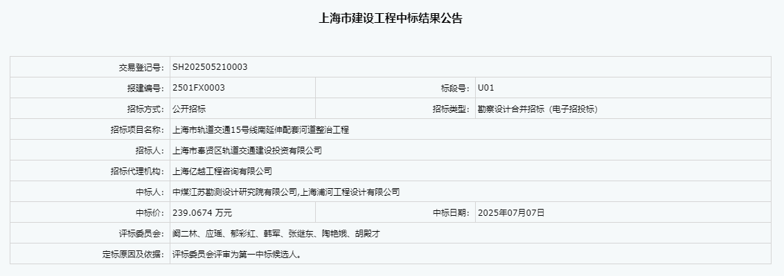 中标结果公告-上海市轨道交通15号线南延伸配套河道整治工程(勘察设计)