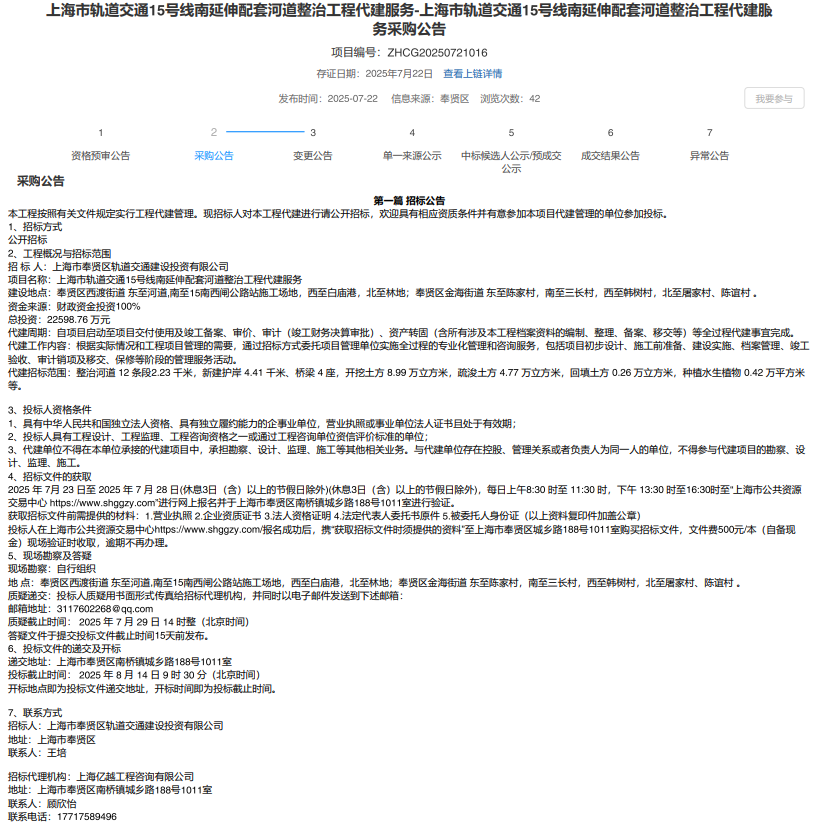 招标公告-上海市轨道交通15号线南延伸配套河道整治工程代建服务