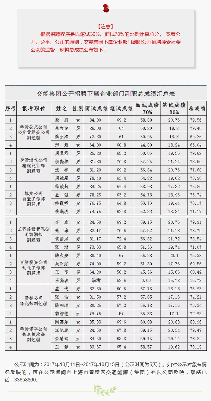 【公示】交能集团公开招聘下属企业部门副职总成绩