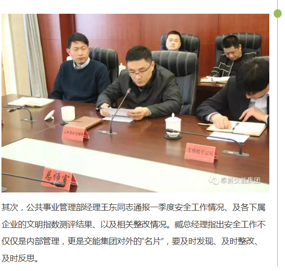 4月12日下午,奉贤交能集团召开了一季度工作会议,集团领导、各部门负责人及下属企业党政主要领导出席此次会议,会议由集团总经理臧雪龙同志主持。