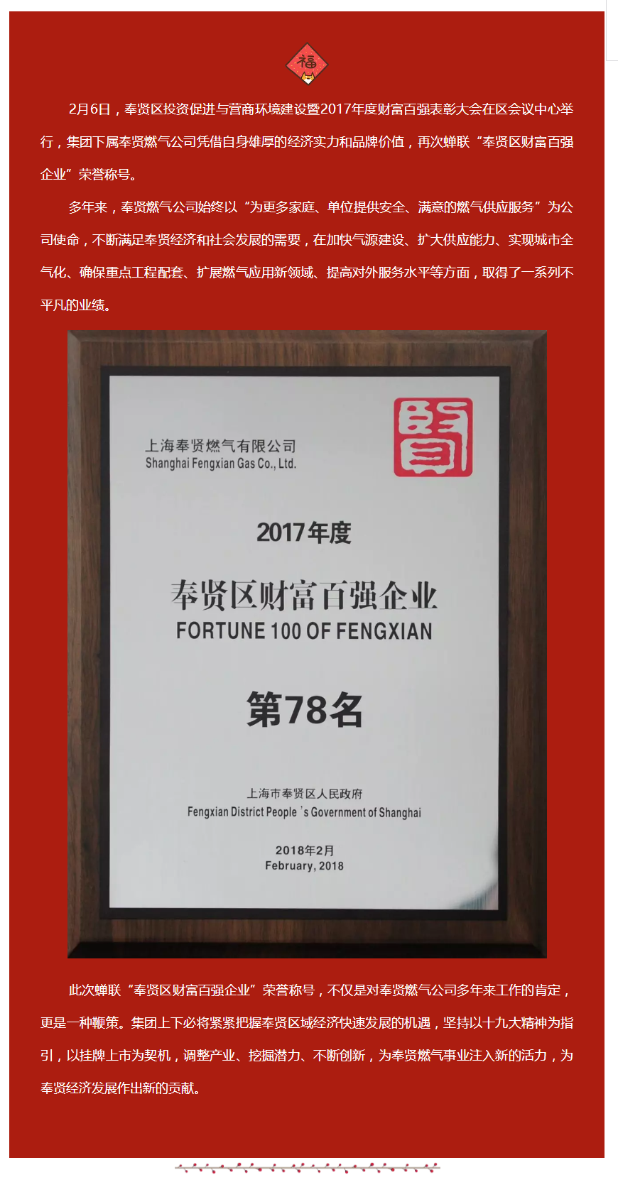 集团下属燃气公司蝉联“奉贤区财富百强企业”荣誉称号