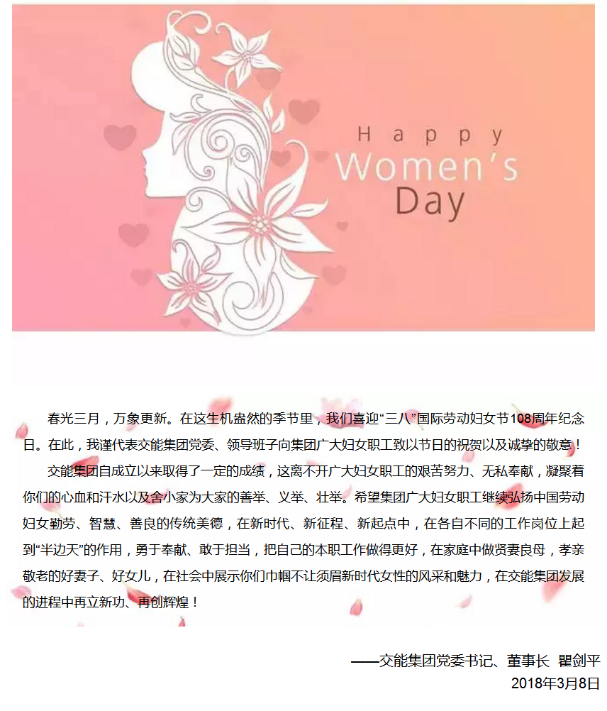 交能集团党委书记、董事长瞿剑平祝所有妇女同志节日快乐!